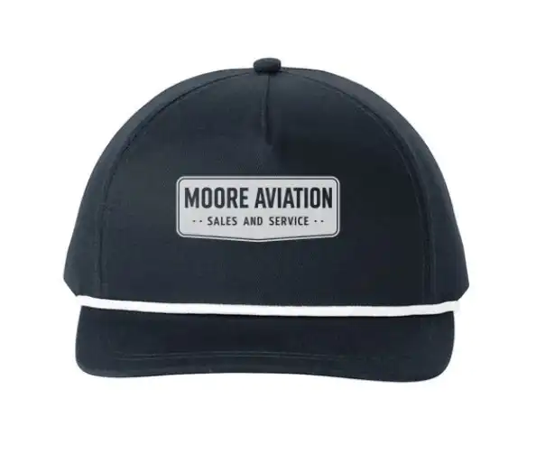 A sharp structured cap with a white rope detail and the “Moore Aviation / Sales and Service” patch on the front. Clean look for the airport, the hangar, or anywhere you want to fly your Moore Aviation colors.
